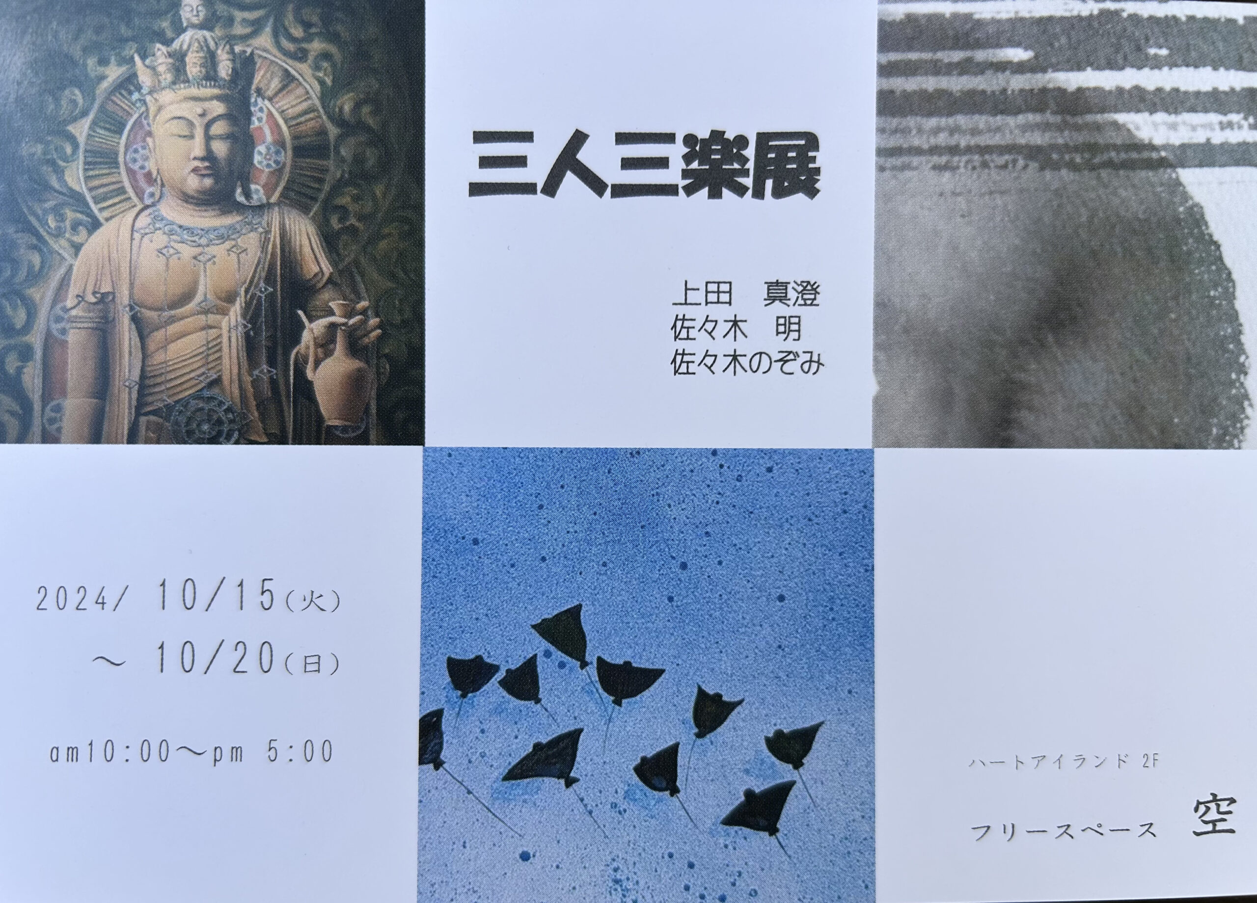 当館2階のフリースペース空にて 10/15(火)〜10/20(日)各日10:00~17:00 「三人三楽展」を開催いたします。上田真澄、佐々木明、佐々木のぞみの三人展、乞うご期待ください。 皆様のご来館をお待ち申し上げま […]